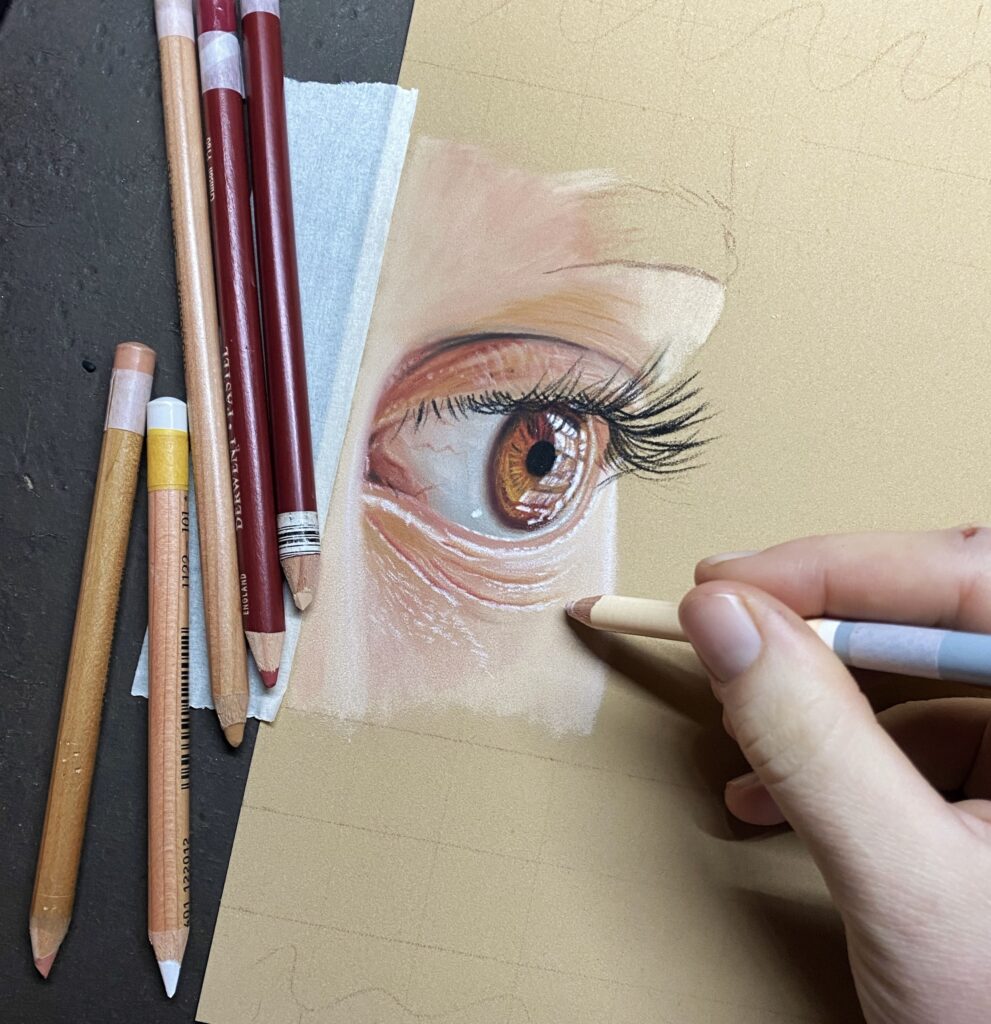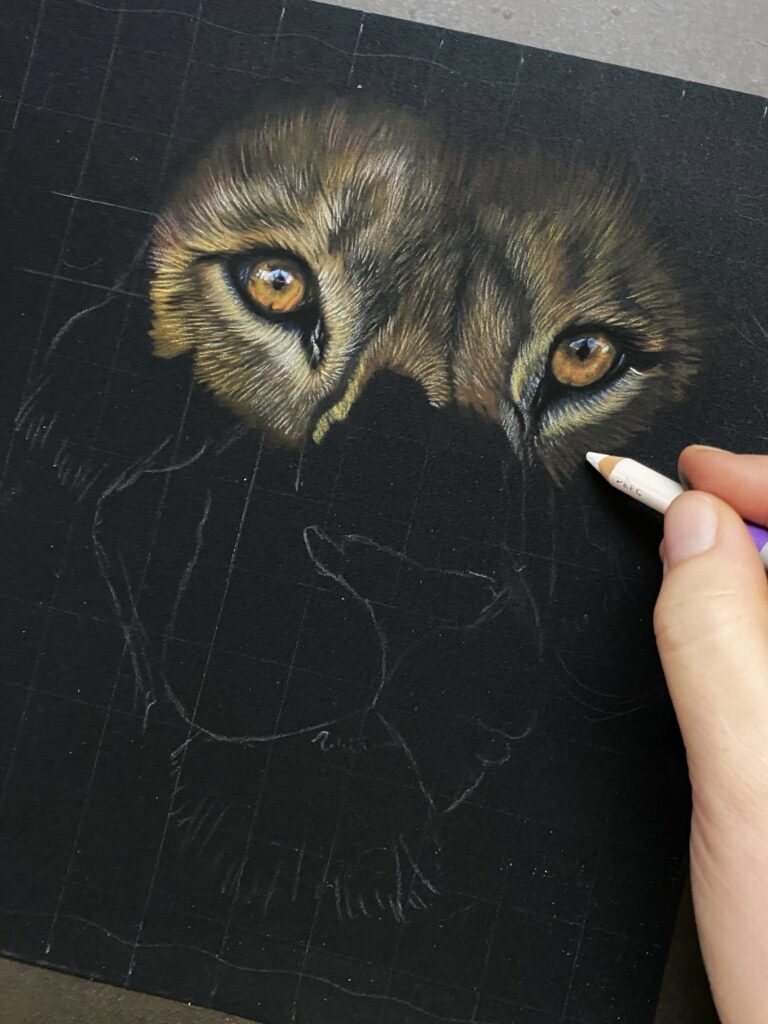 Ik begin de tekening met een basislaag van het eerste oog. De laag is dun omdat het papier niet veel van het potlood vraagt. Daarmee dekt het soms niet helemaal direct. De eerste laag is lastig uit te vegen en te gummen en dat is eigenlijk een heel goed teken. Dat betekent dat het pastel goed in het papier trekt en dat betekent weer dat het meer lagen kan hebben. De volgende lagen pakken ook prima op de eerste laag en zo teken ik rustig verder.