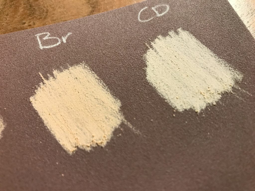 Met zachte pastelpotloden kleur je makkelijker een groter vlak in en met hardere pastelpotloden maak je scherpere details. Ik heb met evenveel druk een laagje ingekleurd met een huidskleur van ieder merk op bruin pastelmat.