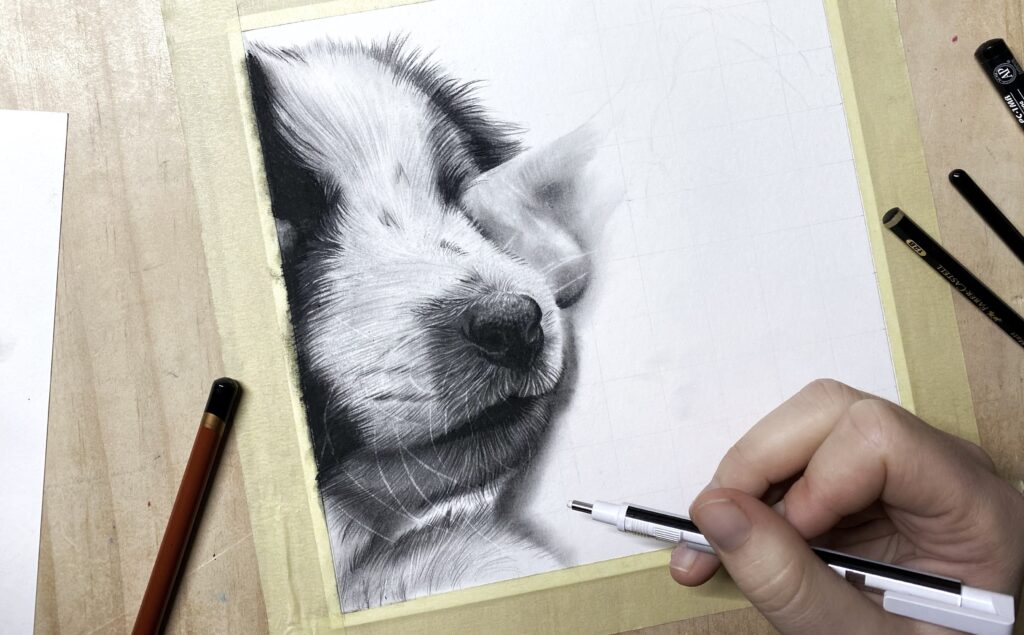 Het is nog goed mogelijk om te gummen in je houtskooltekening, zolang je de laag niet te dik hebt. Hieronder zie je dat ik de witte haartjes in de vacht met een tombow gum erin hebt getekend.
