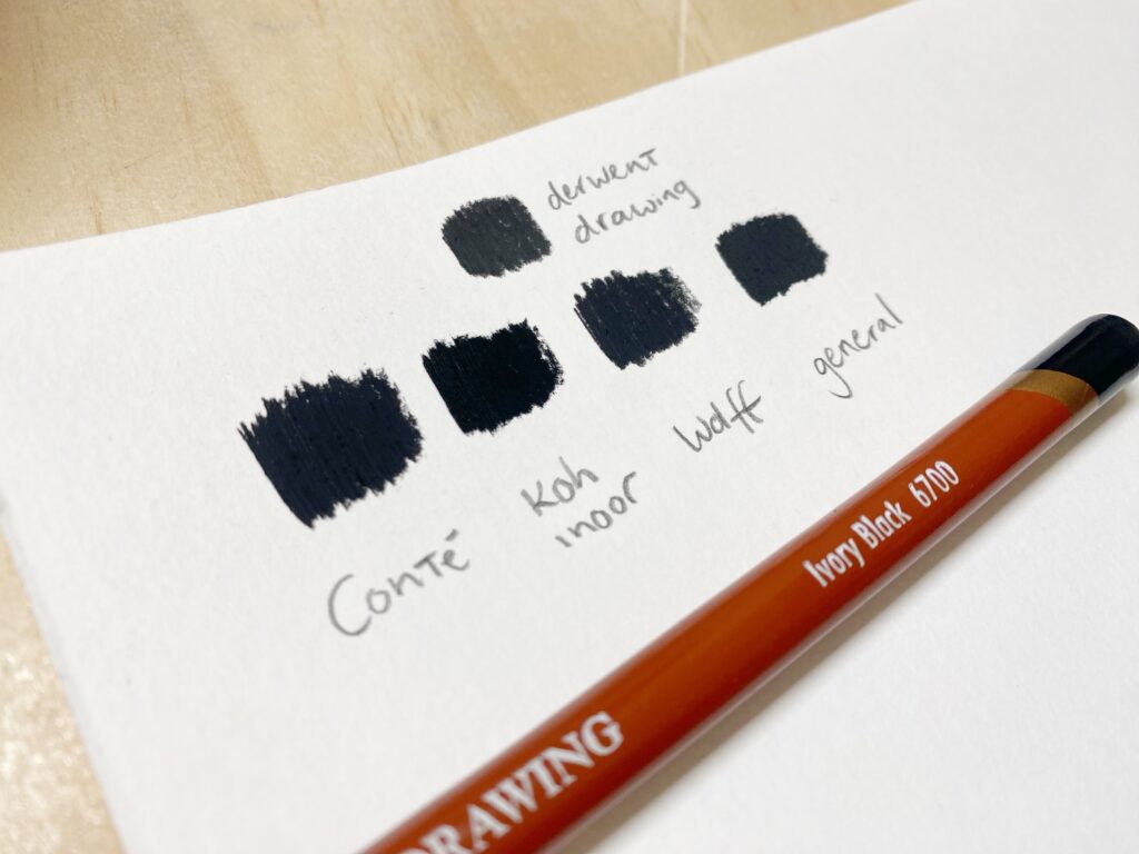 Even een korte test door ze naast elkaar te houden. Koh I Noor springt er boven uit met het diepste zwart. Daarna general en conte en daarna wolff. Al liggen deze 3 wel dicht bij elkaar. Nog een Derwent Drawing zwart kleurpotlood erbij getekend ter vergelijking. Zo donker kan houtskool dus zijn in vergelijking met het zwartste kleurpotlood.