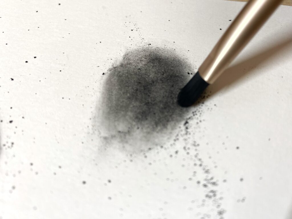 Met dit poeder en een kwastje kan je egaal grotere vlakken opvullen. Dit is bijvoorbeeld handig voor een basislaag. Met het kwastje breng je automatisch heel weinig op je papier aan, zodat je een dunne laag krijgt waarop je alle details nog kwijt kan. Je kan hier nog goed overheen tekenen met grafietpotloden.