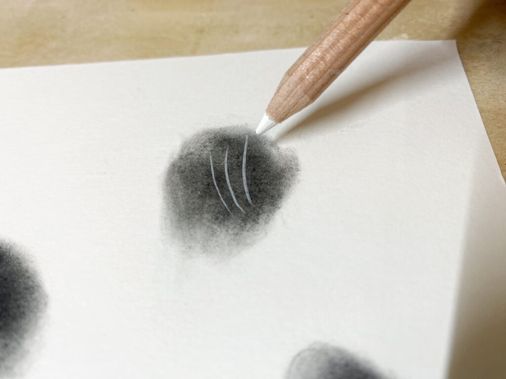 Je kan deze witte houtskoolpotloden ook gebruiken bij grafiet of houtskooltekeningen. Dit pakt het beste op een laagje houtskool dan grafiet. Houd dit in gedachten voor als je nog snorharen wilt tekenen. Je kan ook eerst met een tombow gum een haar gummen en daarna extra wit maken met dit potlood.