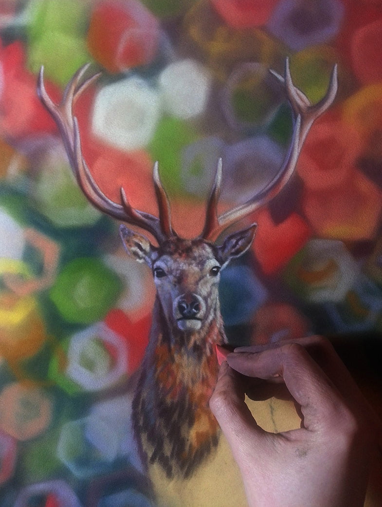 Hahnemühle Velour papier gebruikt Emma Colbert voor haar pasteltekeningen. Je werkt hier met zacht pastelkrijt op bijvoorbeeld Unison krijt. Velours neemt het pastel heel mooi op door de papierstructuur die bestaat uit fijne kleine haartjes. Hierdoor krijg je ook een heel zacht effect in je tekening. Het voelt alsof je aan het schilderen bent met pastelkrijt.