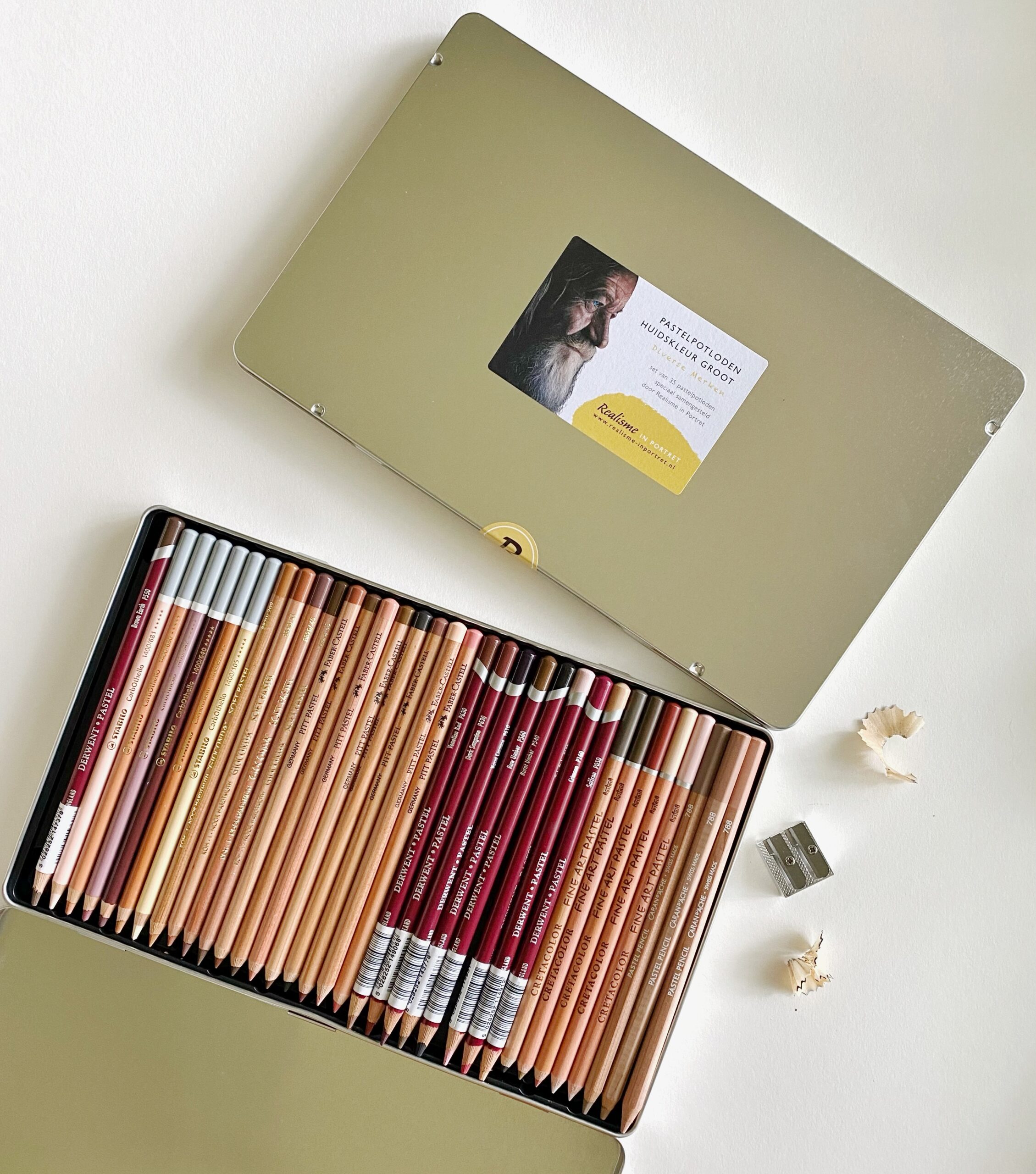 Zitten de pastelpotloden van de kleine set huidskleuren hier ook allemaal in?